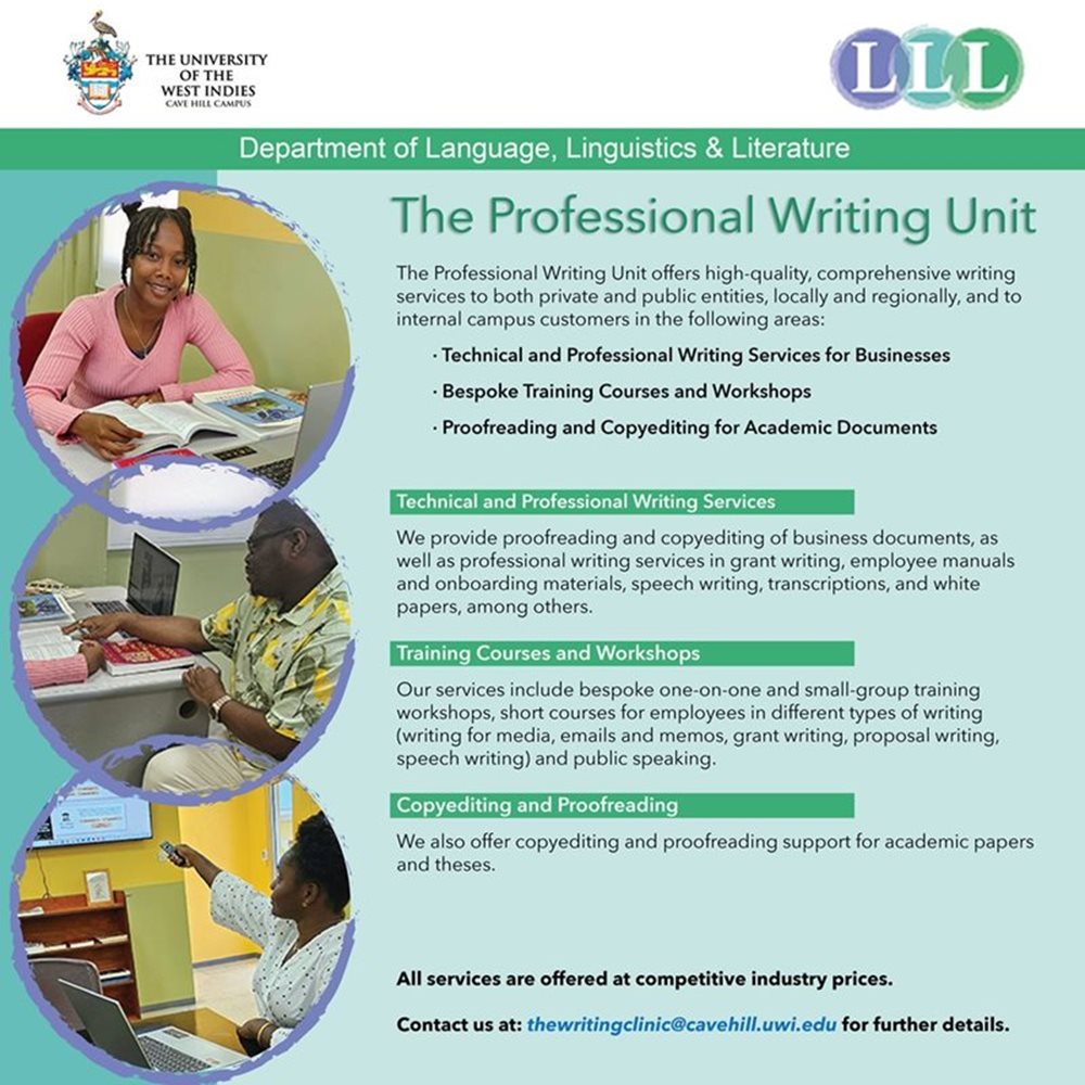 The UWI Cave Hill Professional Writing Unit is here to help you conquer any writing challenge. Our expert team is dedicated to providing a wide range of services designed to meet the needs of students, faculty, and organisations.